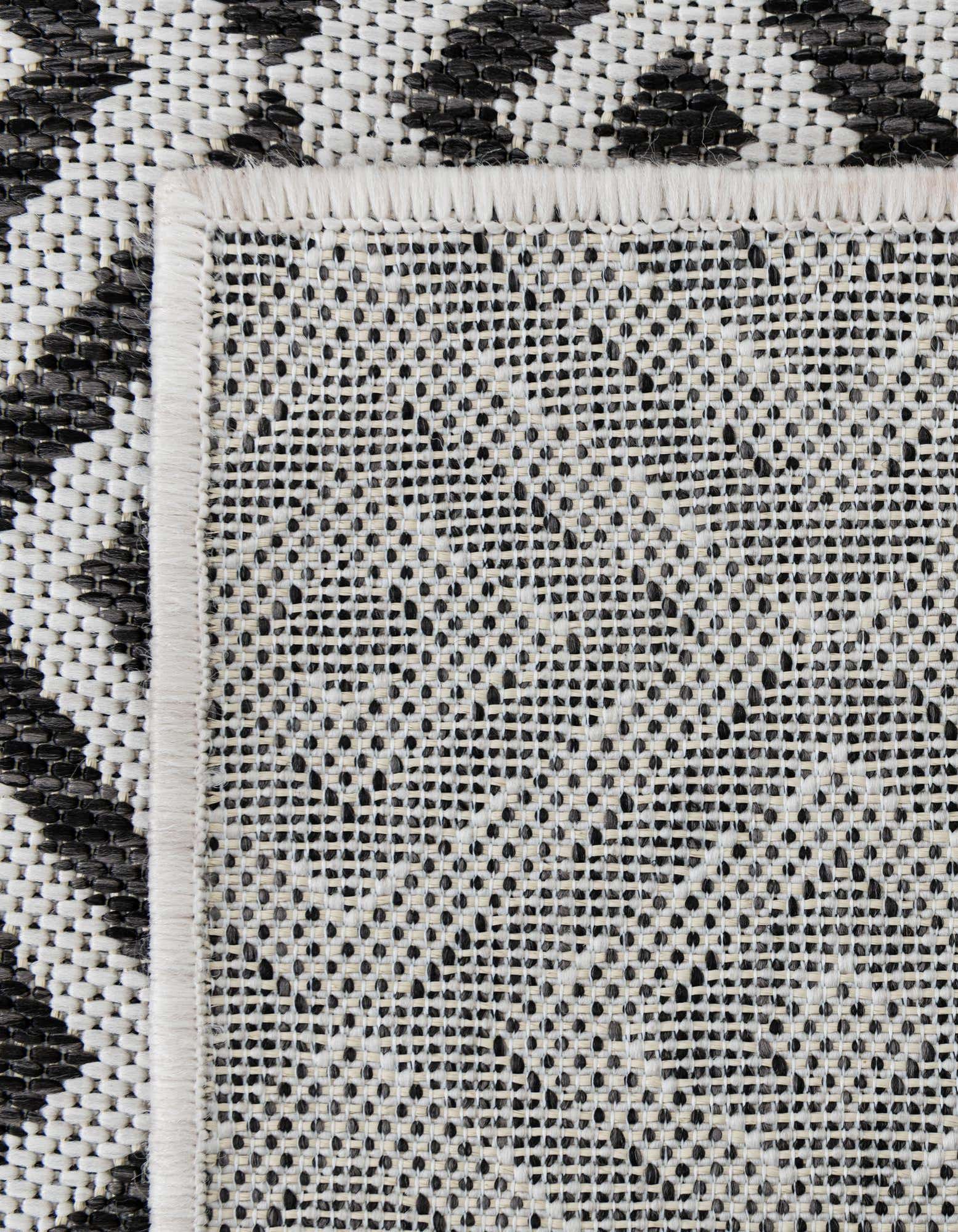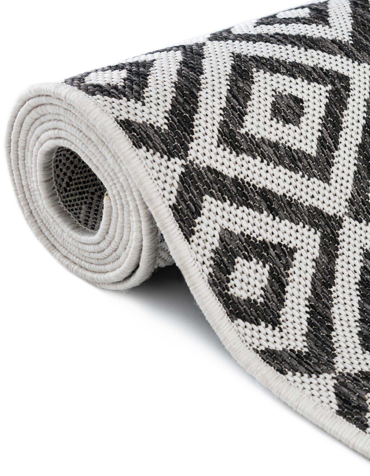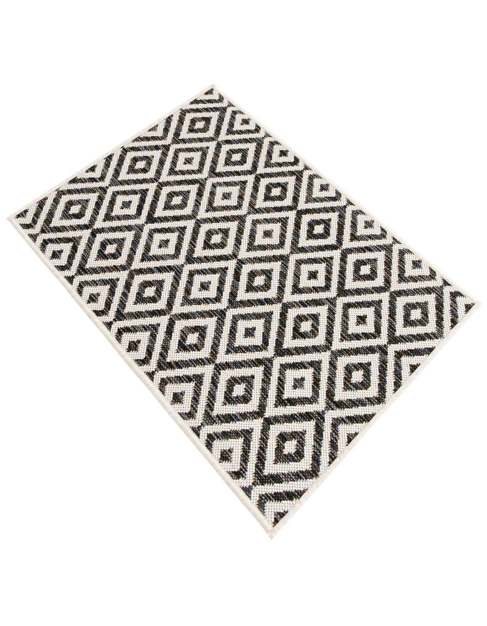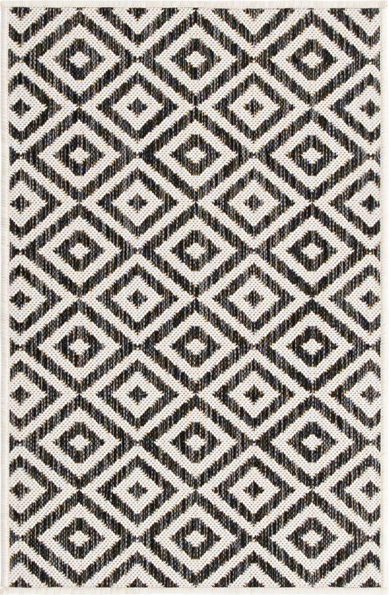Modernes Design: Der Tulum Teppich zeichnet sich durch ein wiederkehrendes Muster aus miteinander verbundenen Diamantformen aus, das auf einem dunklen Hintergrund für Kontrast und visuelles Interesse sorgt. Dieses Design verleiht dem Teppich einen zeitgemäßen und stilvollen Look, der jede Outdoor-Einstellung ergänzt.