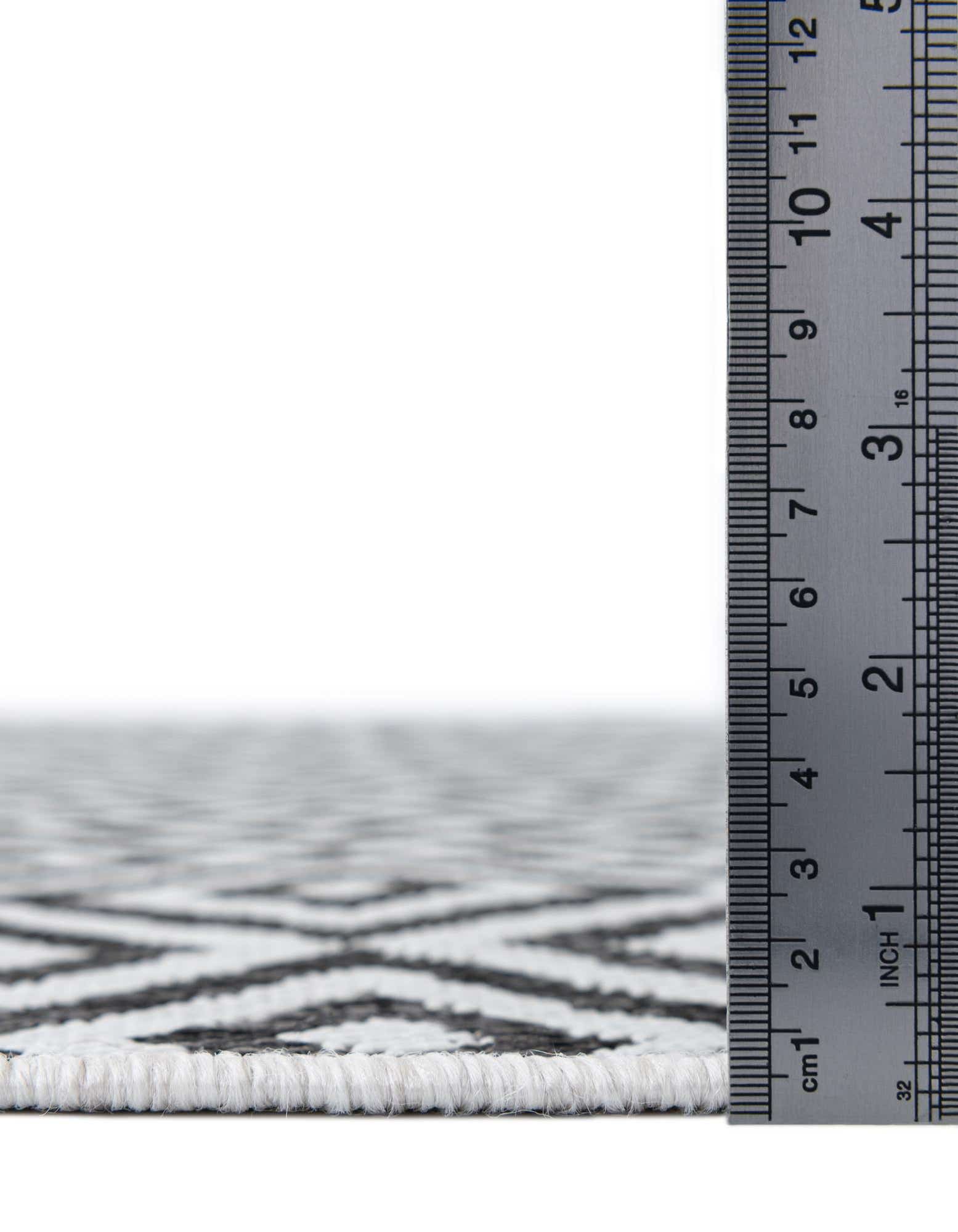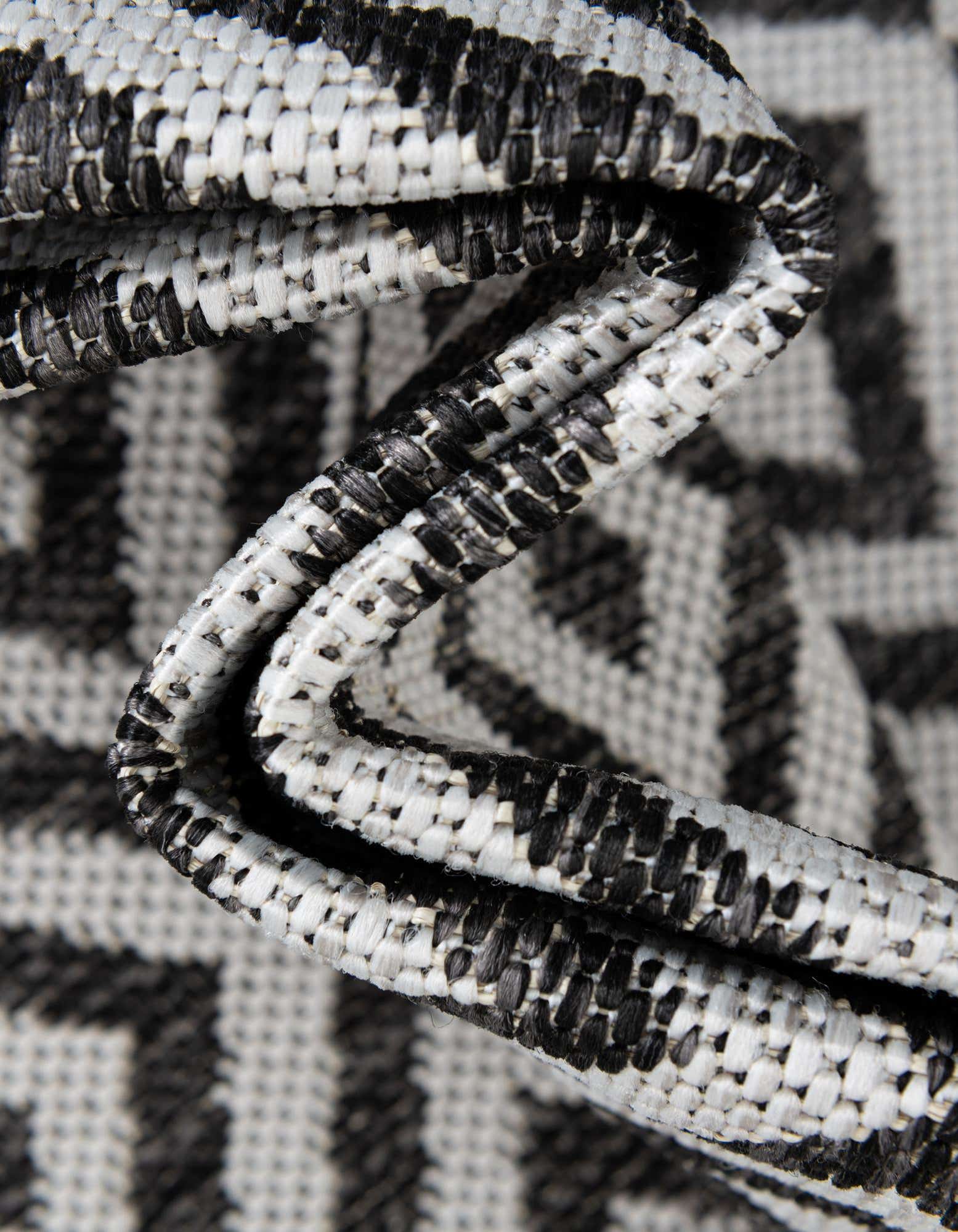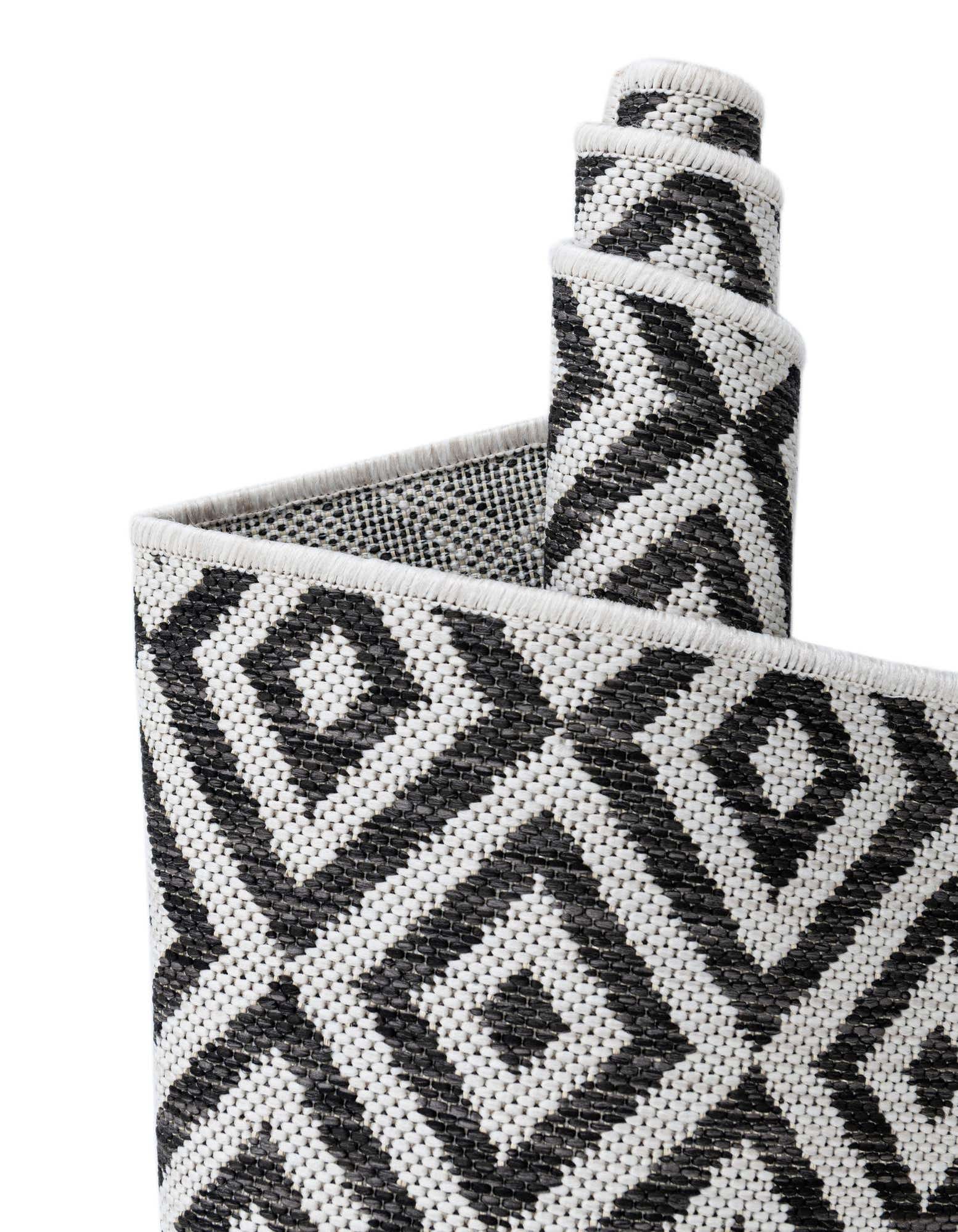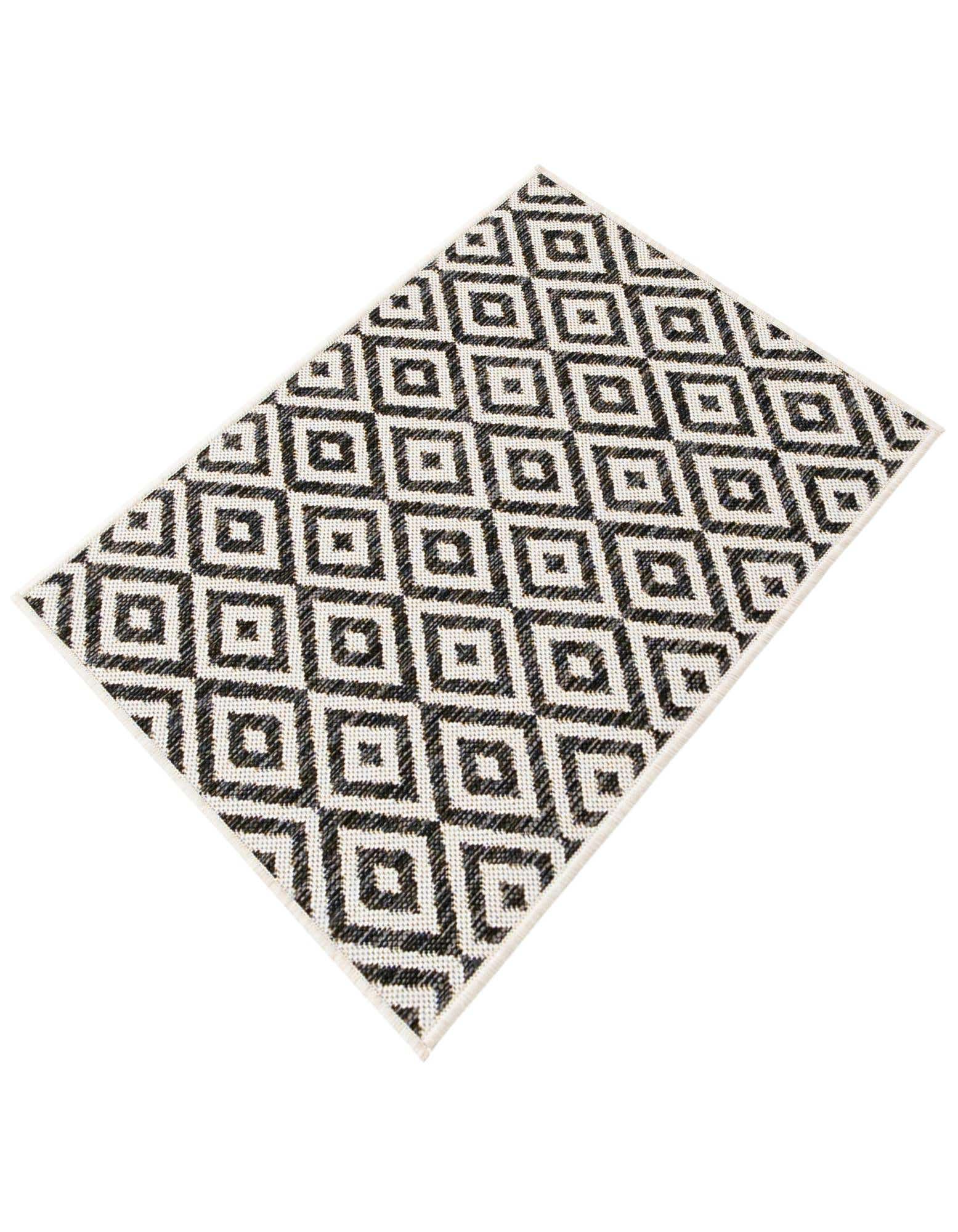 Modernes Design: Der Tulum Teppich zeichnet sich durch ein wiederkehrendes Muster aus miteinander verbundenen Diamantformen aus, das auf einem dunklen Hintergrund für Kontrast und visuelles Interesse sorgt. Dieses Design verleiht dem Teppich einen zeitgemäßen und stilvollen Look, der jede Outdoor-Einstellung ergänzt.