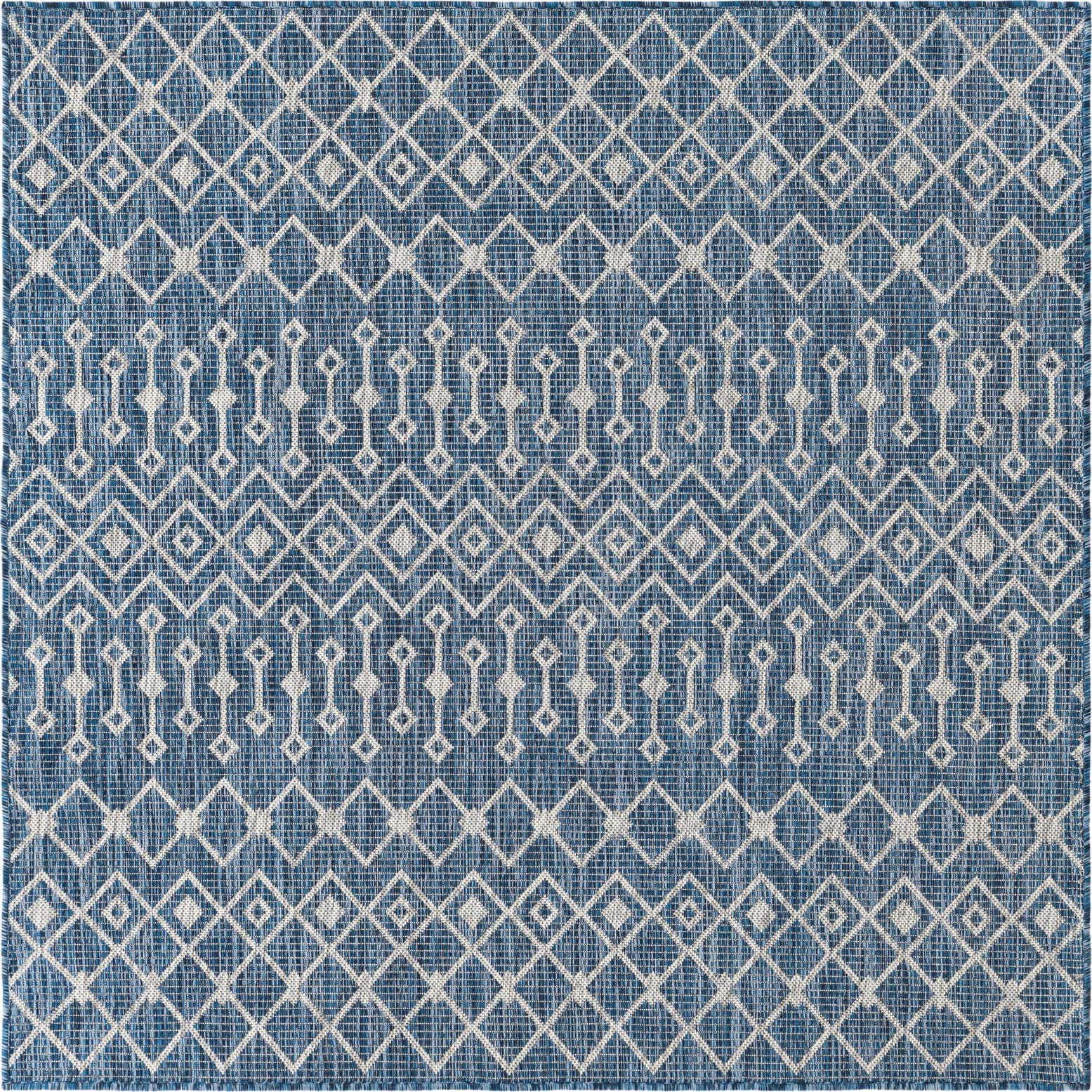 Modernes Design: Der Tulum Teppich zeichnet sich durch ein wiederkehrendes Muster aus miteinander verbundenen Diamantformen aus, das auf einem dunklen Hintergrund für Kontrast und visuelles Interesse sorgt. Dieses Design verleiht dem Teppich einen zeitgemäßen und stilvollen Look, der jede Outdoor-Einstellung ergänzt.